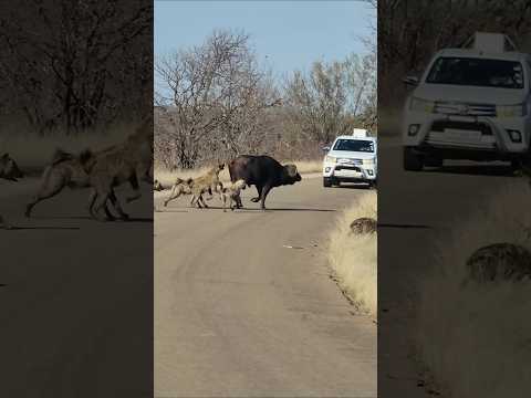Hyena Pack vs. Buffalo Bull: A Dramatic Showdown on the Tar Road. #krugersightings #wildafrica By: KPS Safaris & Tours |